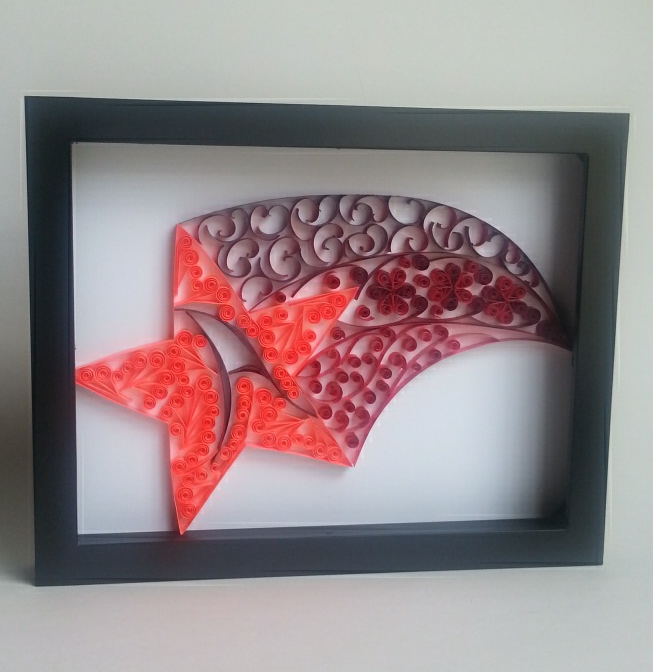 Decorate your walls with this lovely Monogrammed Shooting Star! This handmade quilled artwork is made with 1/4 inch strips of paper. There are 5 shades of red used, from Maroon to a bright Neon. It is framed in an 8x10 shadowbox, ready for hanging.