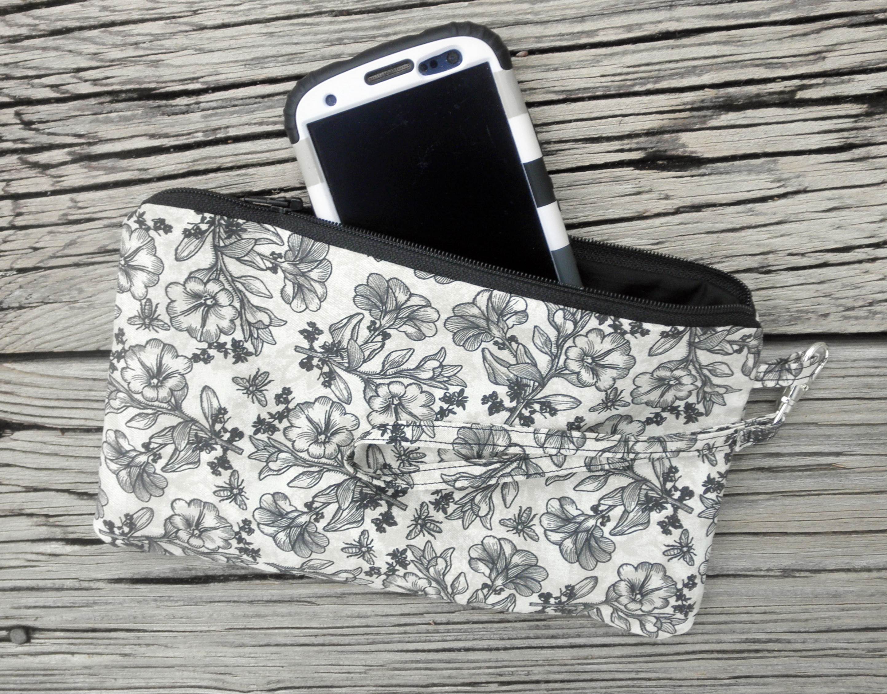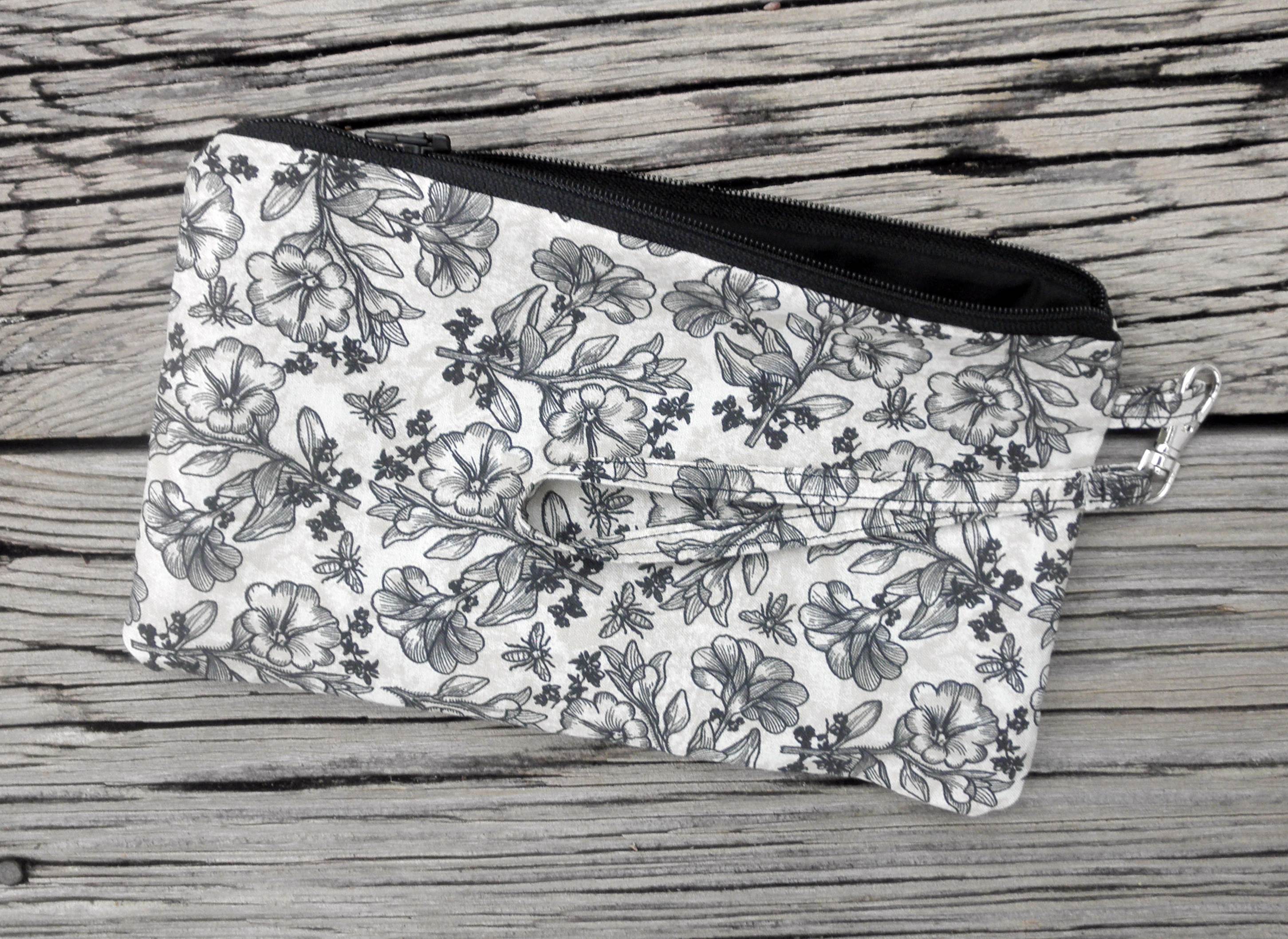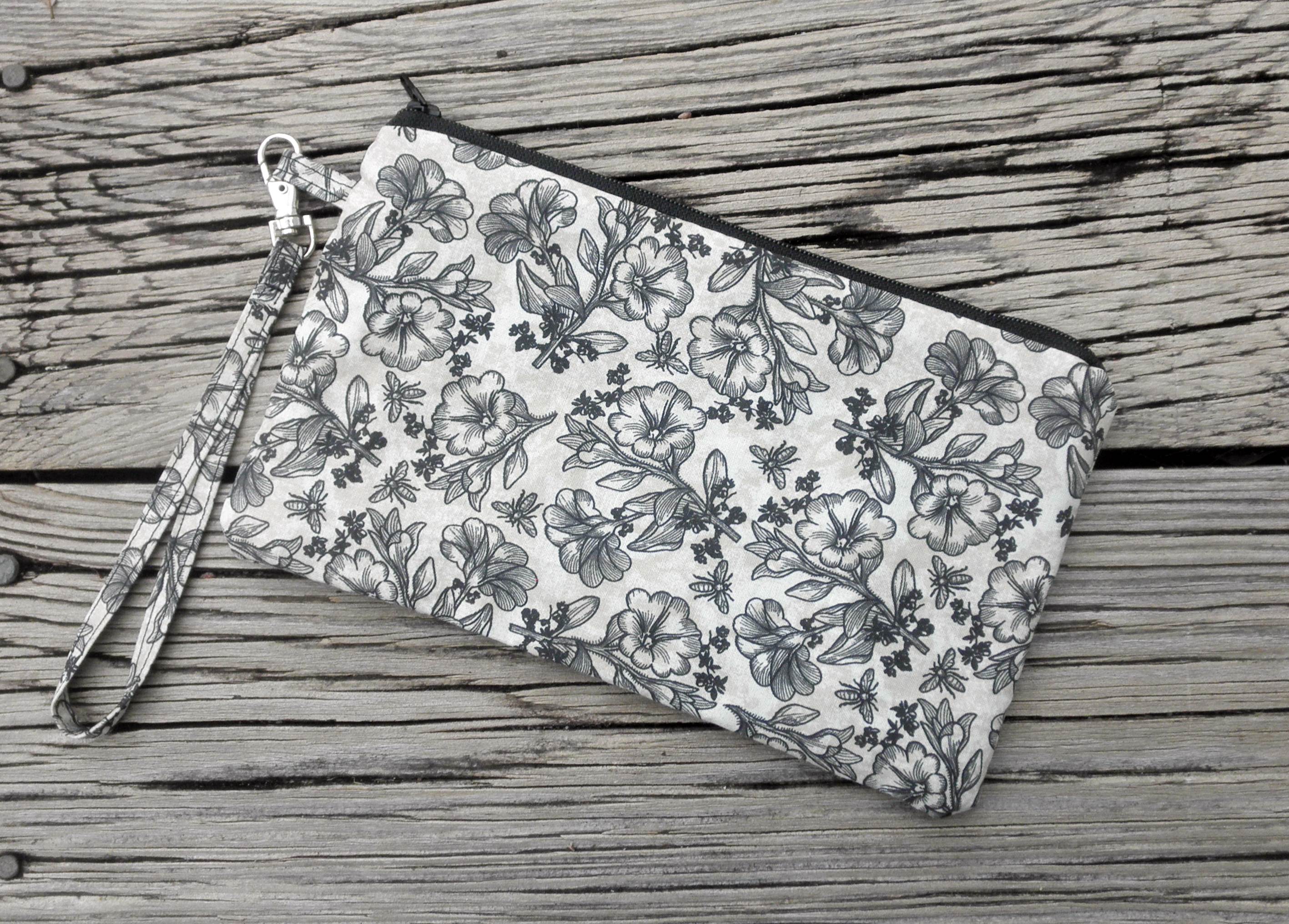 8 1/2 inches long, 5 1/4 inches wide. Beautiful black flower fabric, with black interior lining and a black zipper. Handmade by me.